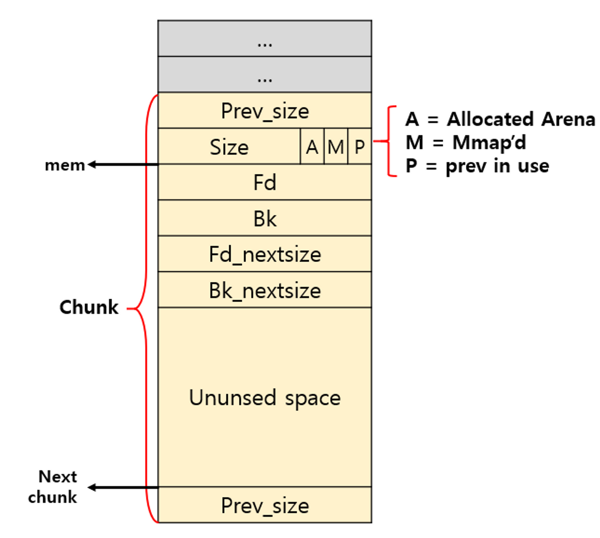 - IS_MMAPPED(M) : 현재 청크가 mmap을 통해 할당된 경우 1로 세팅됩니다. 큰 메모리를 요청하는 경우에는 heap을 이용하지 않고, mmap() 시스템 콜을 통해 별도의 메모리 영역을 할당합니다. 이렇게 할당된 청크들은 bin 내에 속하지 않고, free시 그냥 munmap() 호출로 해제합니다.