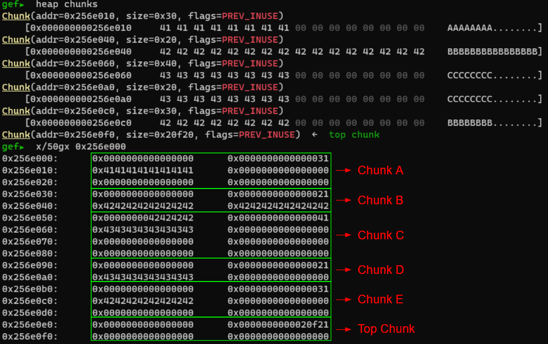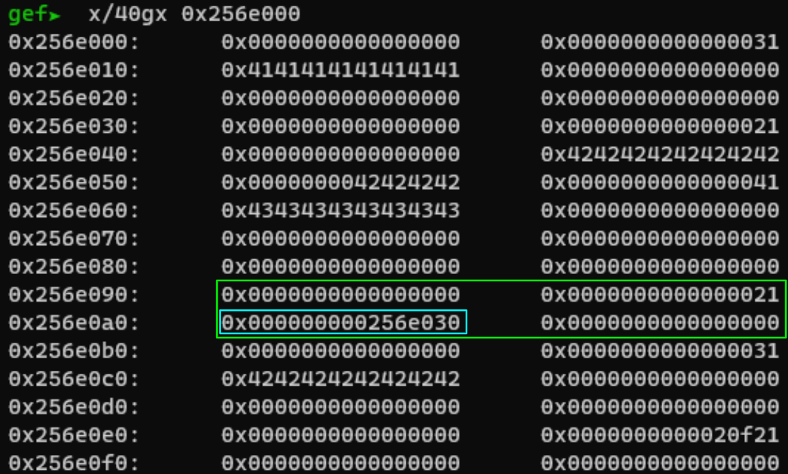 위 그림에서 청크별로 초록색으로 구분했습니다. 아까 청크 설명 부분에서 다음 청크의 prev_size 필드도 현재 청크의 페이로드 부분으로 들어간다고 했습니다. 청크 b에 입력한 데이터가 청크 c의 prev_size 필드까지 들어가는걸 확인할 수 있습니다.