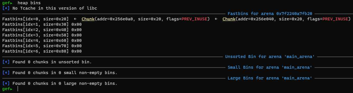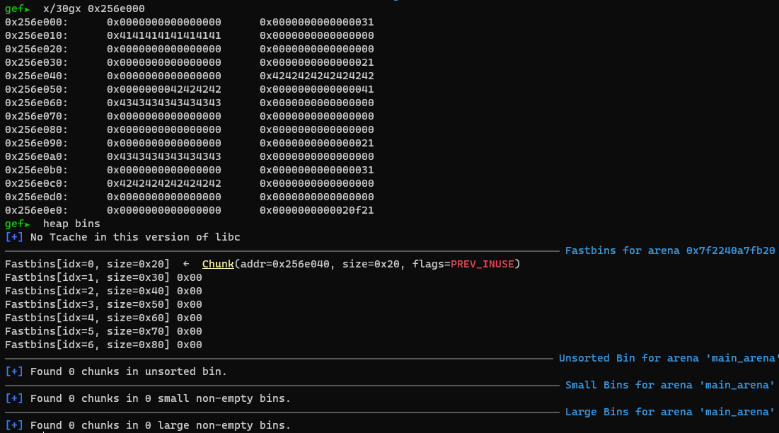 fastbin[0] ← 청크 d ← 청크 b로 연결되어 있는걸 볼 수 있습니다.