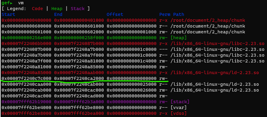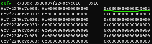 malloc이 반환해준 주소를 확인해보면 기존의 할당받았던 주소가 아닙니다. 반환해준 주소의 size 필드를 확인해보면 하위 2번째 bit가 1로 세팅되어 있기 때문에 mmap으로 할당받은 영역인것을 확인할 수 있습니다. 이 영역이 어디에 위치하는지는 vmmap으로 확인가능합니다.