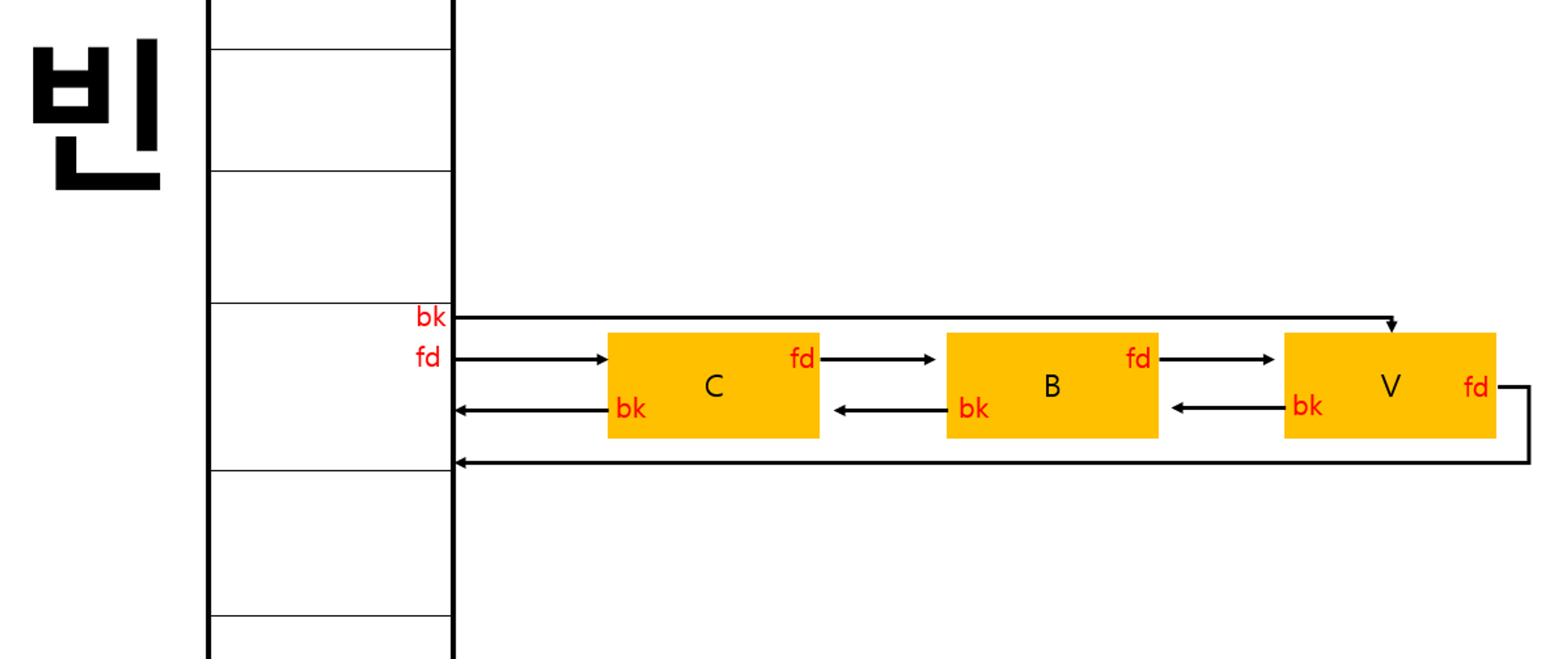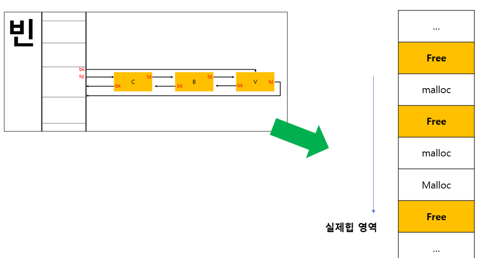 bin이 free된 청크들을 관리하기 위한 방법으로 실제 heap영역에서 free된 청크들을 이중 연결 리스트로 연결시켜 놓습니다(fastbin은 단일 연결 리스트입니다).