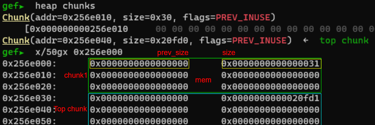 top chunk의 사이즈가 0x20fd1로 세팅되어 있습니다. 할당된 청크는 이전 청크가 없기 때문에 prev_size가 0인걸 볼 수 있습니다. malloc함수가 사용자에게 반환해주는 주소는 mem의 시작주소로 0x256e010 일 것입니다. 이 주소부터 입력하는 데이터가 들어갑니다.