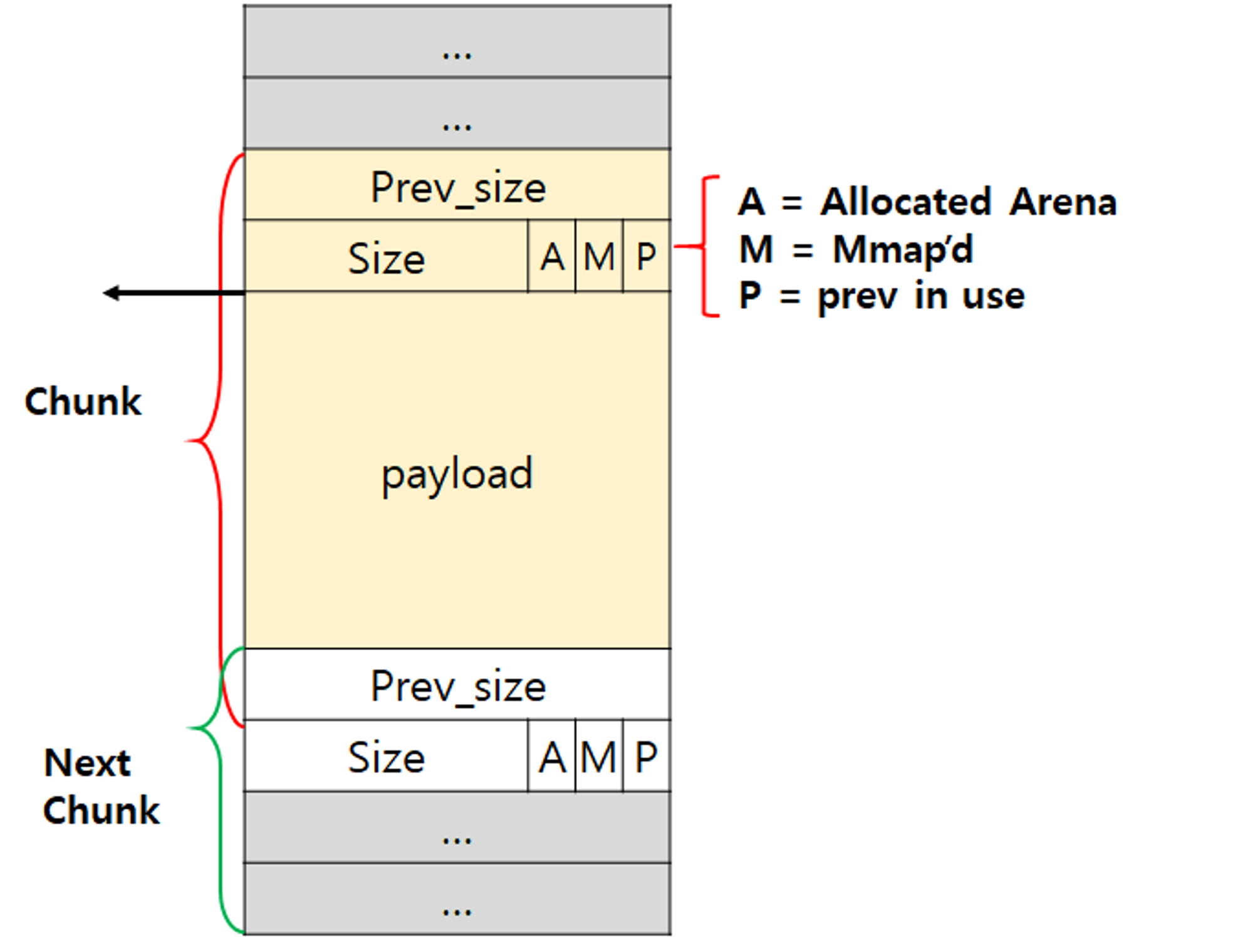 malloc함수가 호출됨으로서 할당받는 영역을 청크라고 부릅니다. 32bit 환경에서는 청크가 8byte 단위로 할당되고, 64bit에서는 16byte 단위로 할당됩니다. 일반적으로 malloc을 호출하고 반환되는 주소에 데이터를 입력하게 되는데, malloc함수가 반환해주는 주소는 청크의 시작주소가 아닌 페이로드의 주소입니다.