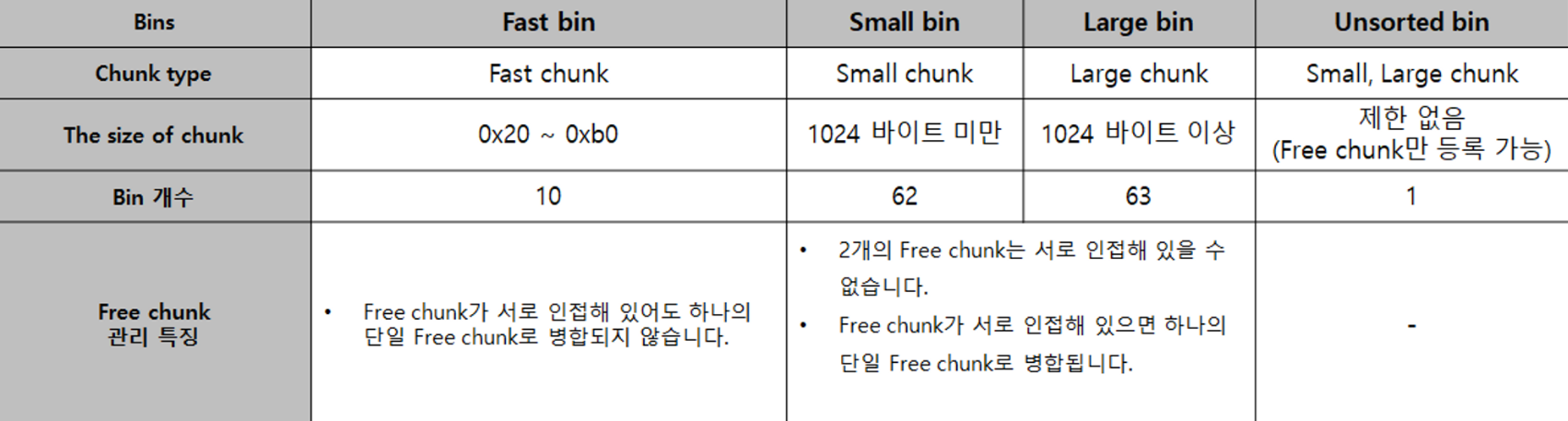 - 즉, unsorted bin의 경우 단 한번의 재할당 기회만 주어집니다. Unsorted bin의 특징은 다음과 같습니다.