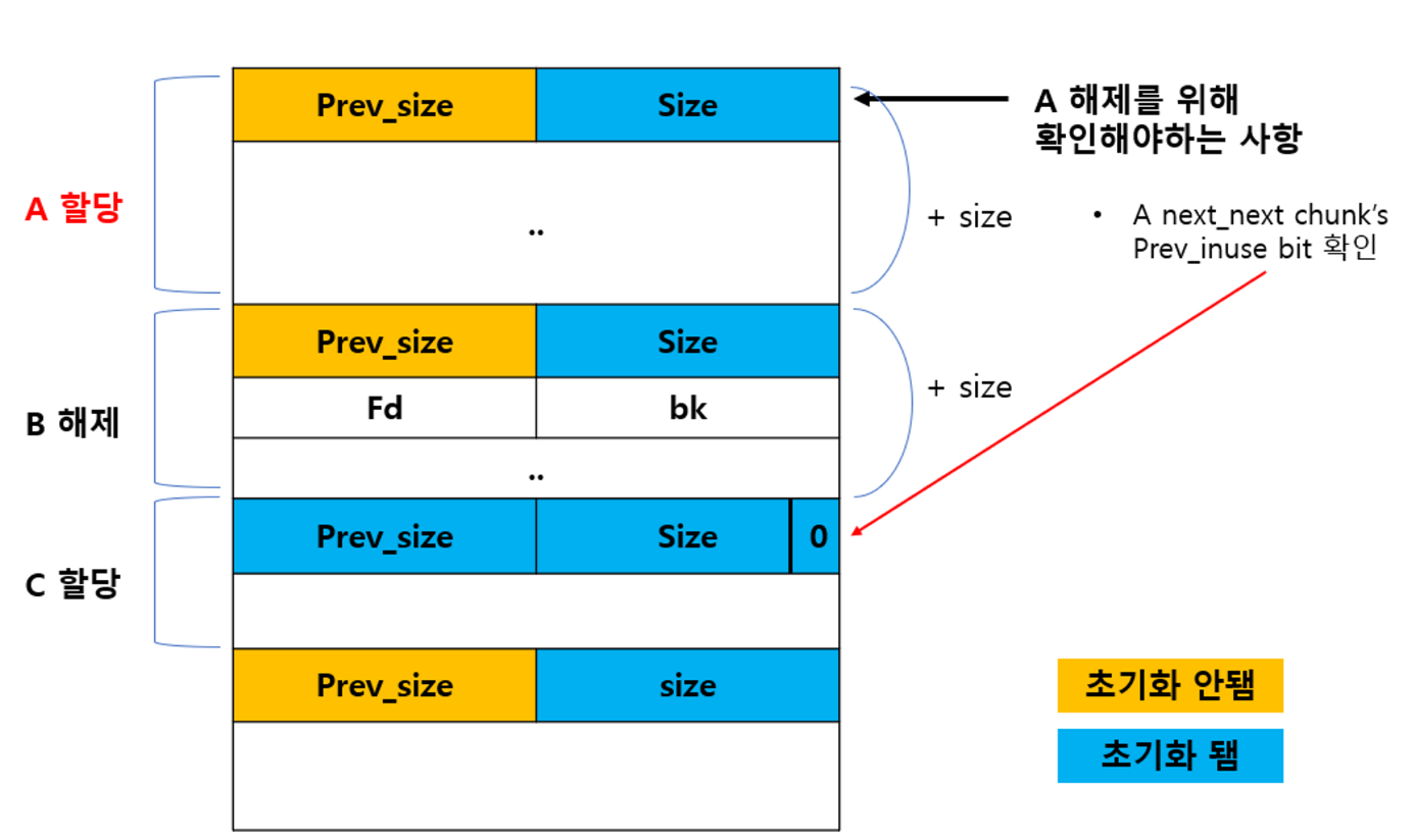 - 해당 bin에는 2개의 Free chunk가 서로 인접해 있을 수 없다.