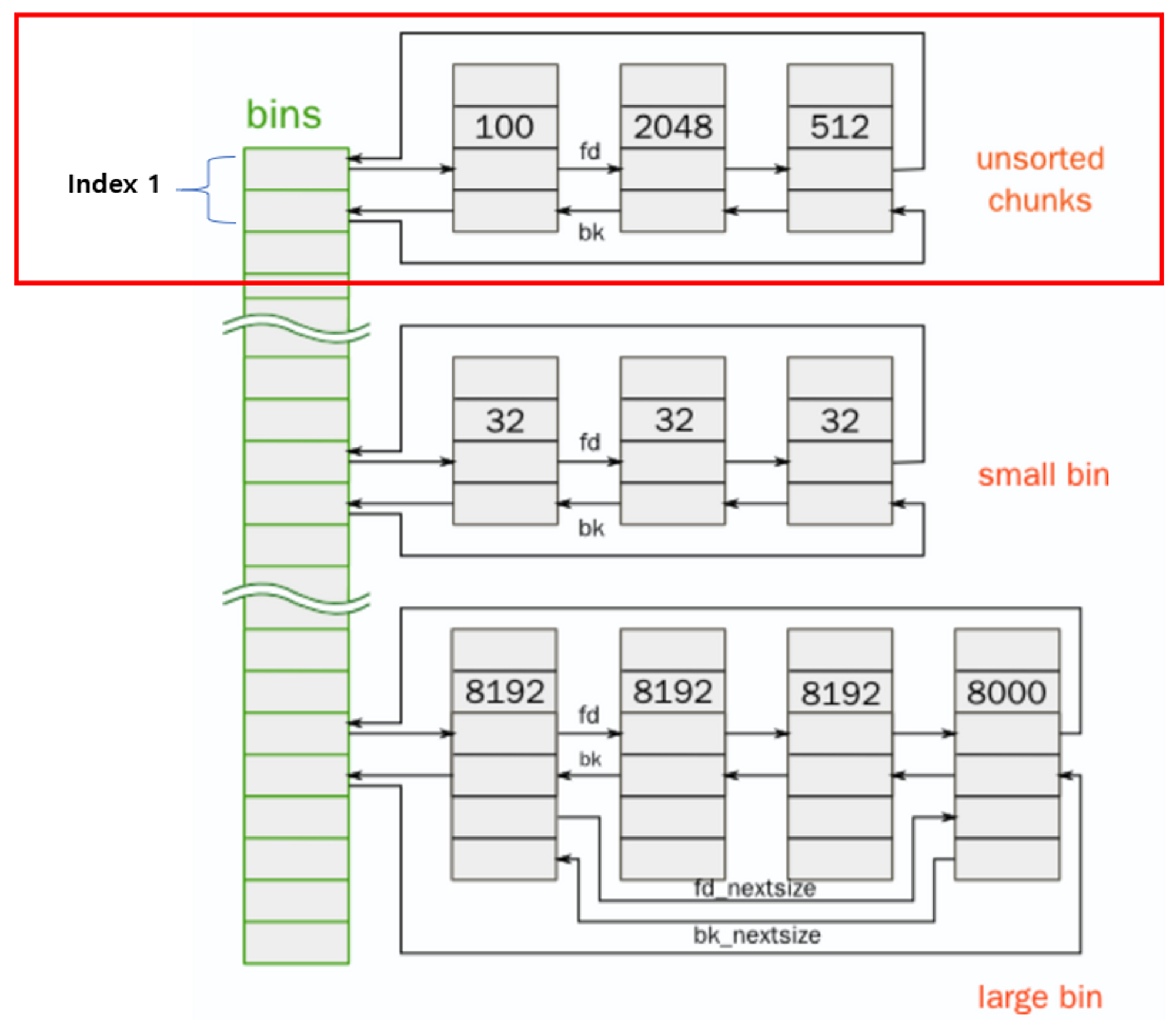 위 사진은 bins의 구조를 대략적으로 표현한 그림입니다. 맨 위에 index1 리스트가 바로 unsorted bin입니다.