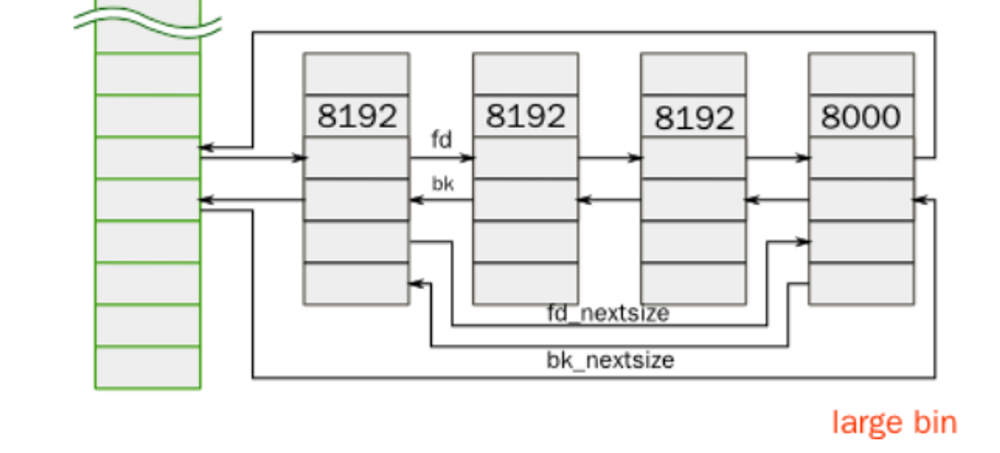 - 동일한 크기의 청크끼리는 fd_nextsize, bk_nextsize가 연결되지 않는다
