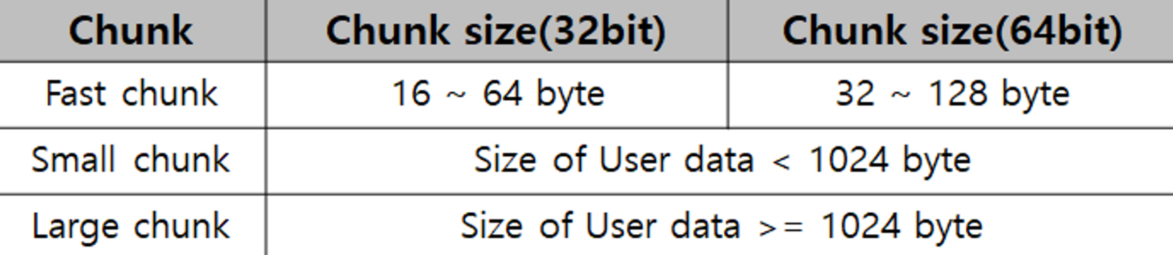 할당된 청크는 청크 사이즈의 크기에 따라서 다음과 같이 구분됩니다.
