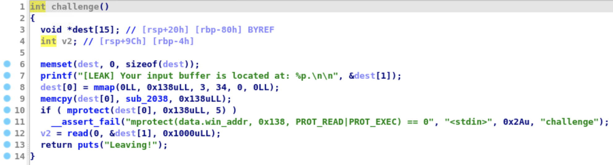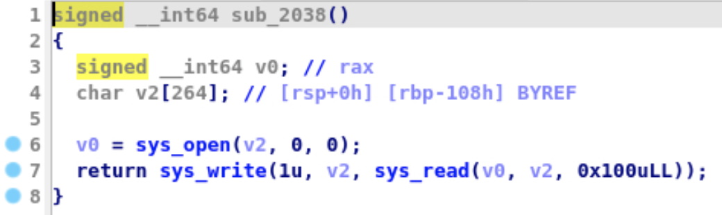 9번째 라인을 보면 sub_2038 함수를 dest[0]에 복사합니다. 그리고 입력 버퍼는 dest[1]에 존재합니다.