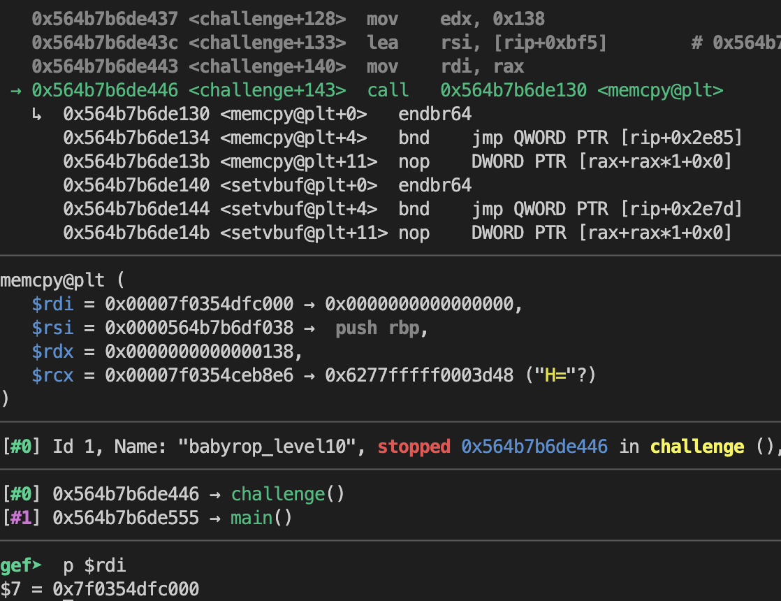 먼저 memcpy 함수 호출 할 때 브레이크 포인트를 설정해서 rdi 레지스터 값을 확인해서 win 함수 포인터의 주소를 확인해보겠습니다.